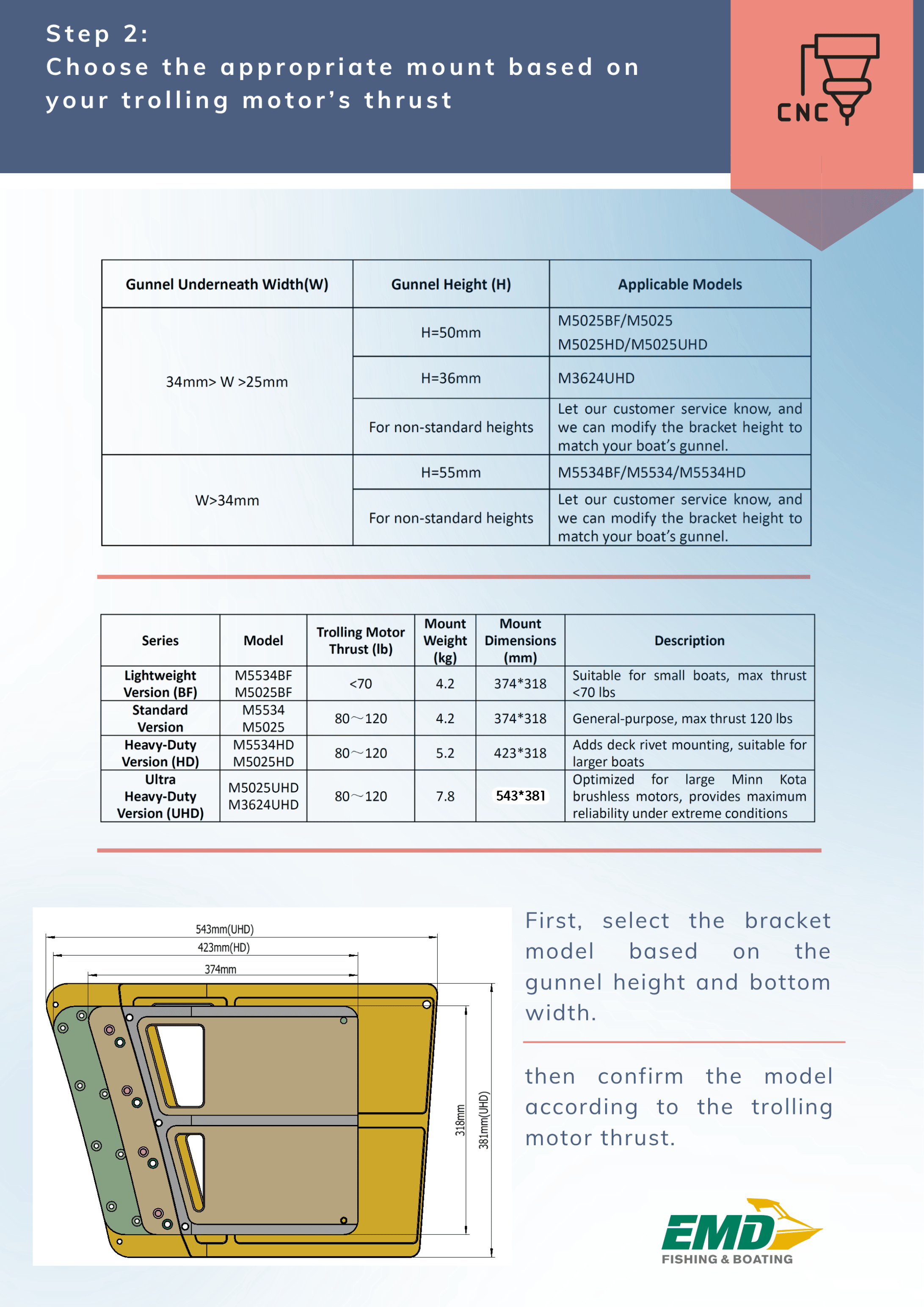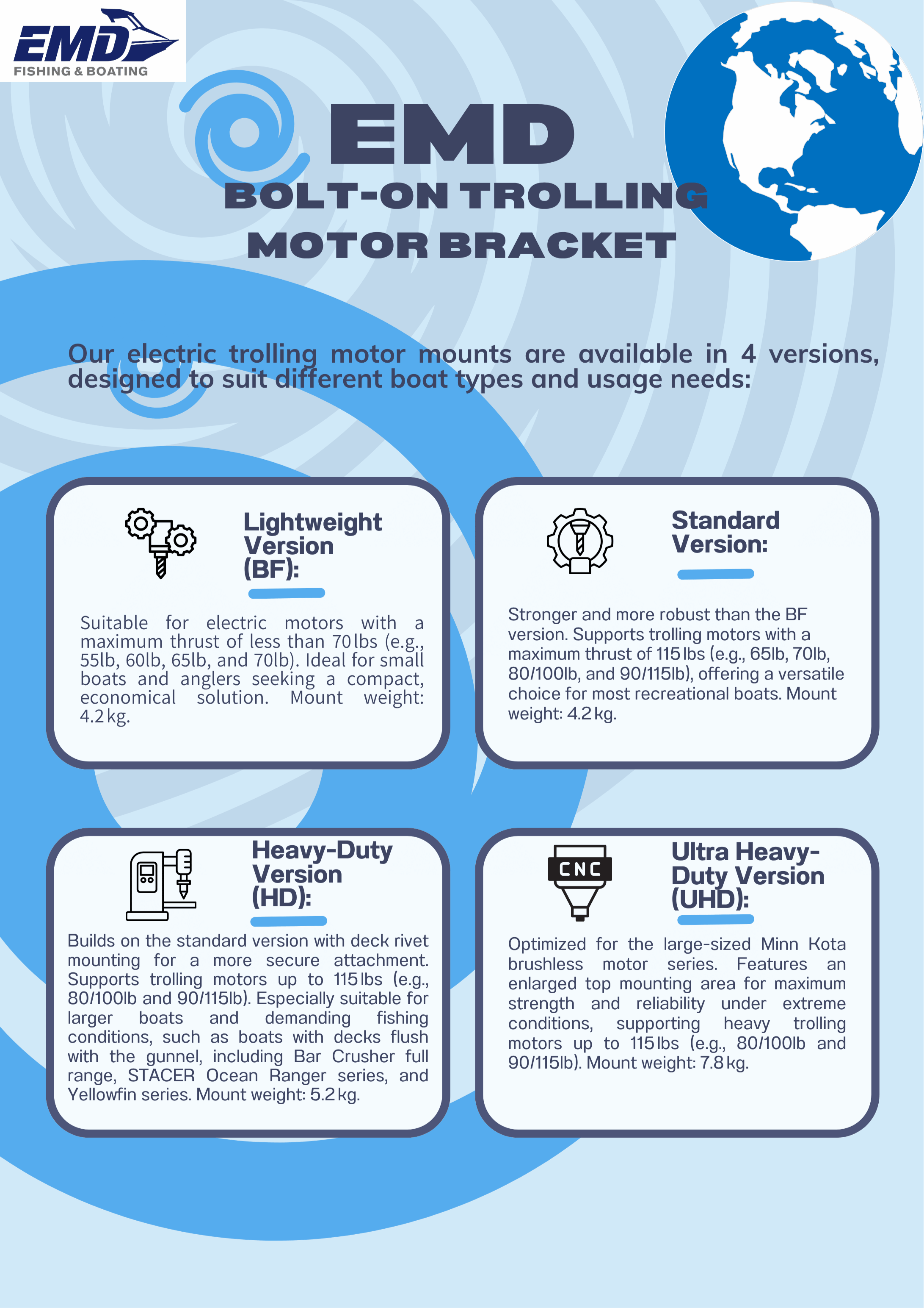 The EMD bolt-on bracket is inspired by outboard motor mounting systems — whether it’s a 50HP or a 200HP engine, all are securely fastened with bolts. Therefore, there’s no need to worry about the strength or reliability of a bolted trolling motor mount.The Heavy-Duty(HD) bracket is further reinforced with eight 6.4 mm aluminium rivets between the bracket and the deck to strengthen the connection between the bracket and the hull. The Ultra Heavy-Duty (UHD) version increases the number of rivets to ten for even greater rigidity and durability.